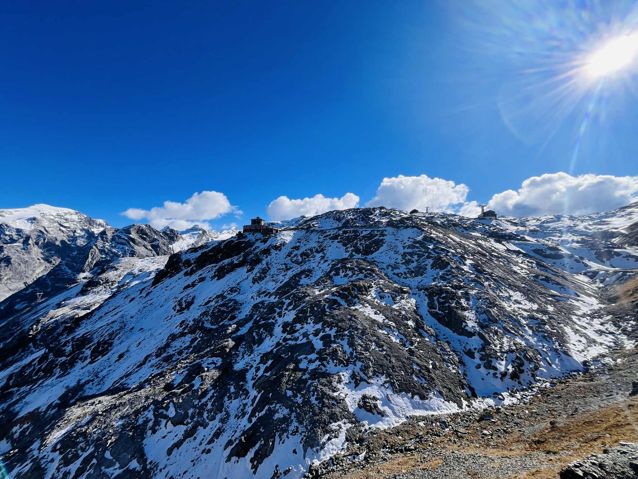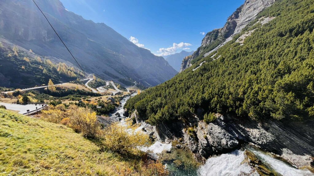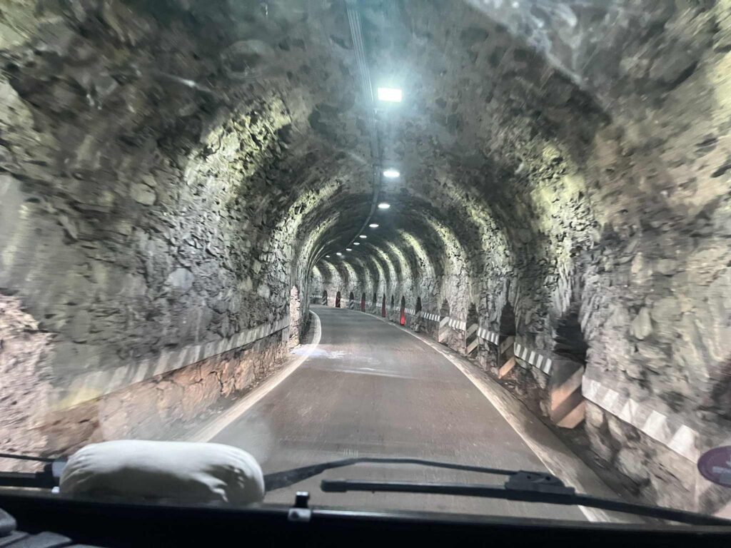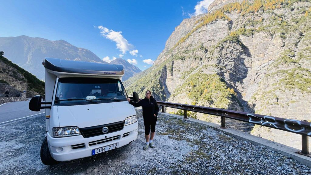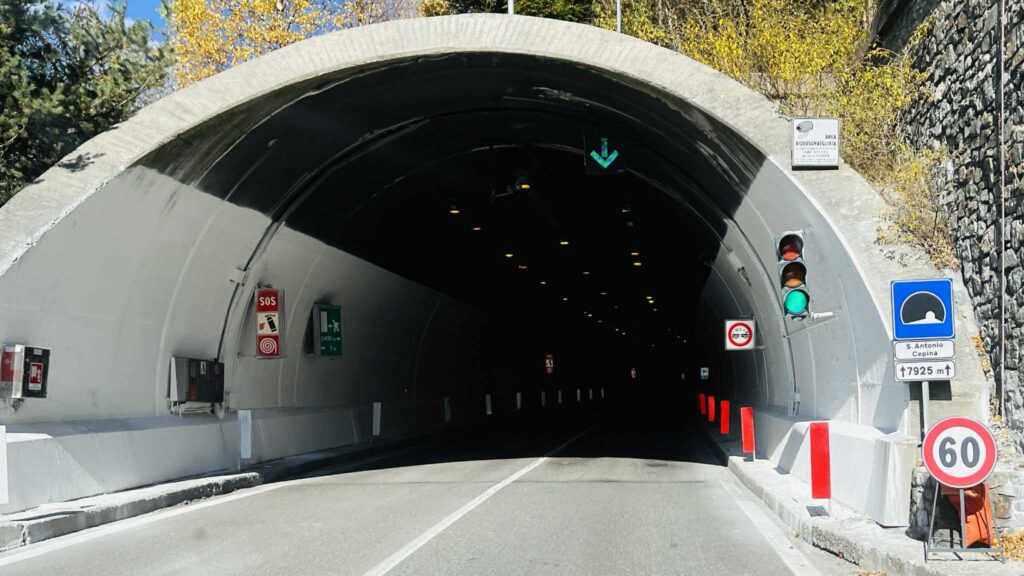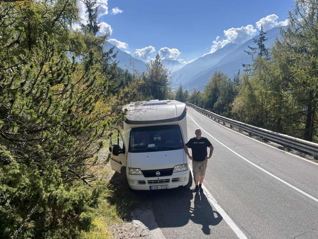 Bormio är omgiven av galet höga berg, och vi säger till varandra: ”Tur att vi inte ska upp på de där…Men så börjar vi köra, och det går svagt uppför… och fortsätter uppför… och uppför. Hmmm – det här var mysko, stod det verkligen inget om det här? Vi stannar vid 1 160 meters höjd så husbilen får andas lite och passar på att fota som de turister vi är. Sedan fortsätter vi. Vägen smalnar av och varnar för tunnlar med 3,5 meters höjdbegränsning. I en tunnel får bara en bil plats, vilket en mötande bilist snabbt inser när han får backa ut för att ge oss plats. ”Störst går först”, som man säger – och jag backar inte baklänges i en kurva inne i en tunnel!