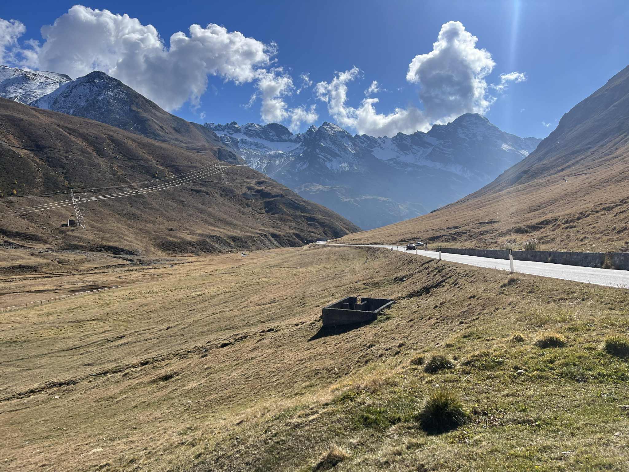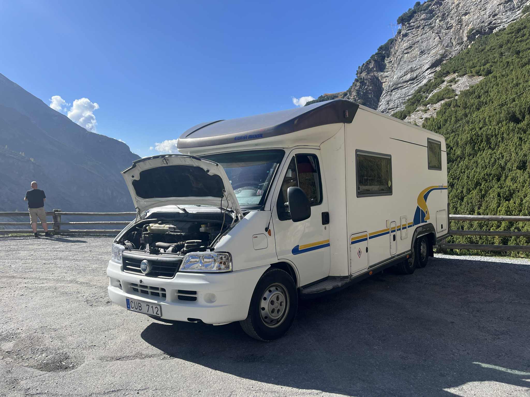 Nu börjar vi inse att detta kommer bli en tuff resa. Det finns inte ett enda flackt parti, så vi stannar med jämna mellanrum för att kyla motorn – det blir kallare ju högre upp vi kommer. Vägarna blir till serpentinvägar där man verkligen inte vill möta någon i kurvan. Det är så snävt att man nästan ser bakdelen på husbilen! Men det går ändå bra, motortempen håller sig normal. Jag använder ett gammalt knep: full värme i kupén. Det funkade förr, och det funkar nu också – bilen är ju från 2004.