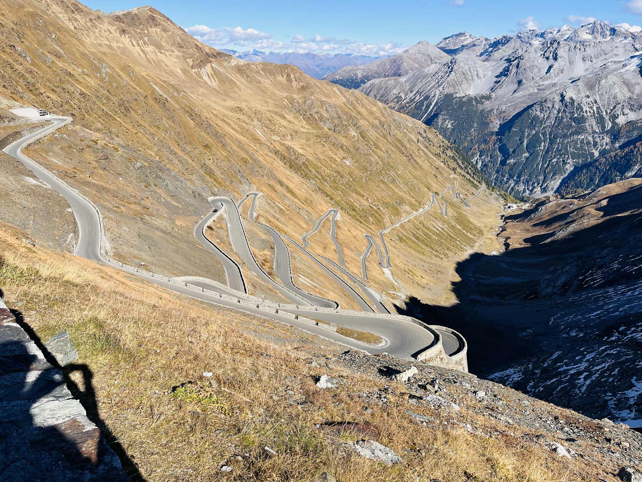 Så bär det av nedåt. Vi håller mellan 35–50 km/h, med hårnålskurvor hela vägen. Var det 48 kurvor upp, så är det minst lika många ned! Många är ännu snävare, så jag får ibland stanna mitt i kurvan, backa lite och ta nytt tag. Lutningen inåt känns läskig – man tror nästan bilen ska välta.